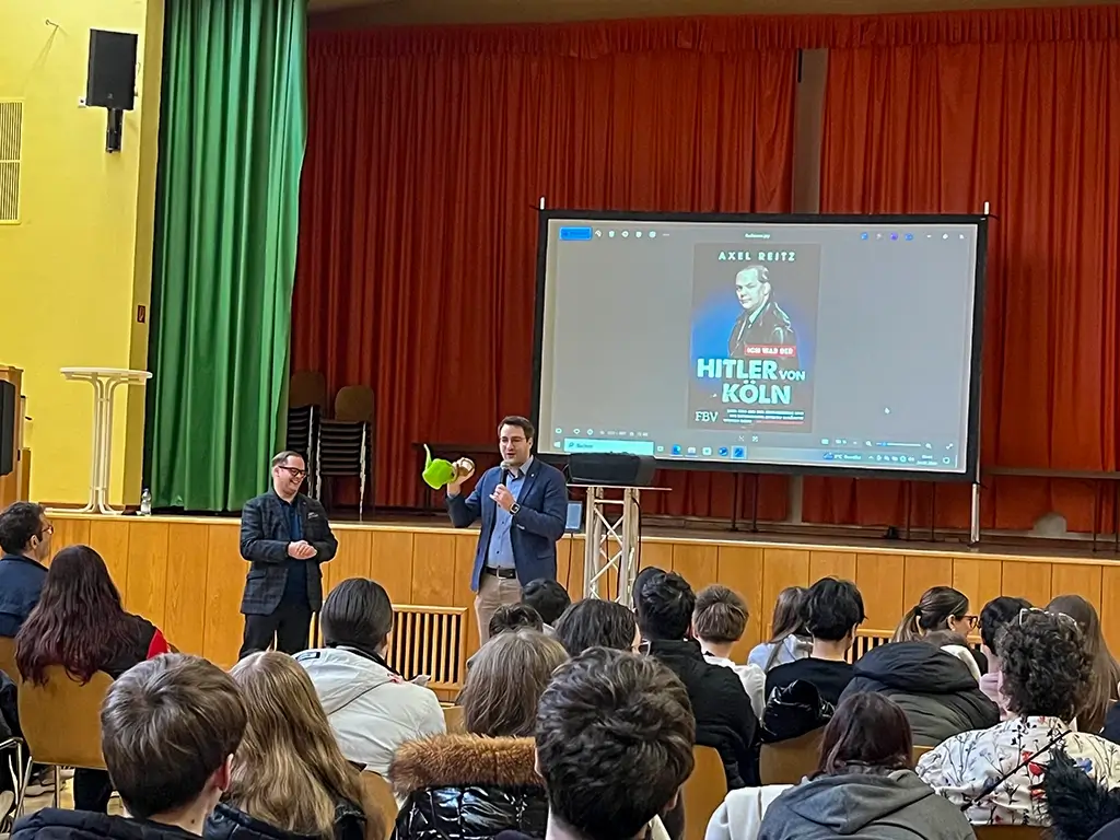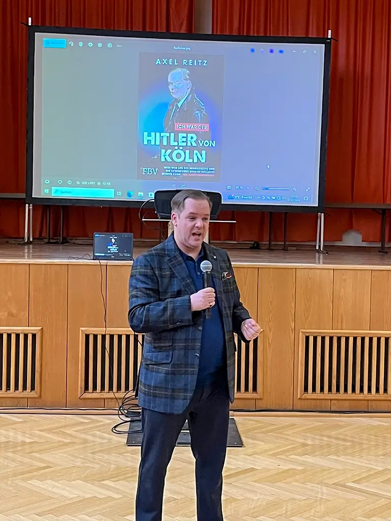 Alzenau. „Ich war ein übler fanatischer Extremist und habe mein Leben gegen die Wand gefahren!“, als der 42-jährige Axel Reitz diesen Satz sagt, ist es mucksmäuschenstill in der TSV-Halle. Am 24. Februar steht kein Unterricht für die Schülerinnen und Schüler der achten, neunten und zehnten Klassen der Karl-Amberg-Mittelschule an, sondern ein packender Vortrag. Auf der Leinwand ist das Buch des ehemaligen Rechtsradikalen zu sehen. Titel: „Ich war der Hitler von Köln – Mein Weg aus der Neonazi-Szene und wie Extremismus effektiv bekämpft werden kann“.